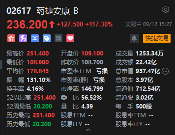 药捷安康盘中涨幅扩大超130%诚利和,本周股价累涨超270%,6月底上市以来累涨超1600%。截至发文,药捷安康涨117.3%,报价236.2港元,成交额逾22亿港元。